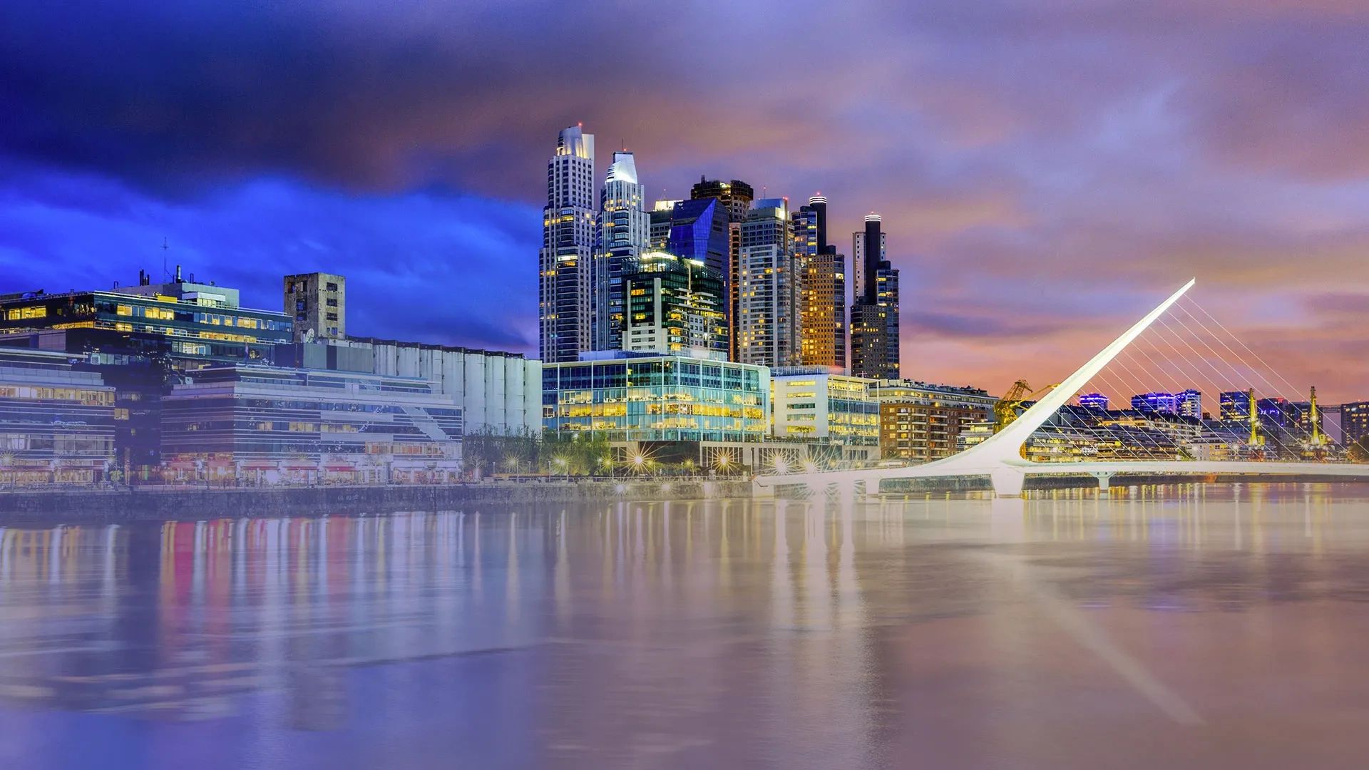 Es una obra del arquitecto español Santiago Calavatra. Fue inaugurado en el año 2001 y realizado en Vitorio, España debido a que el acero con el que está construida no se fabrica en Argentina. El diseño es una síntesis de la imagen de una pareja bailando tango. Se trata de un puente peatonal de 170 metros de largo y 6,20 m. de ancho dividido en tres secciones: dos fijas en ambas márgenes del dique y una móvil que gira sobre un pilón cónico de hormigón blanco y permite en menos de dos minutos el paso de las embarcaciones. Esta sección central está sostenida por una aguja de acero con centro de cemento de unos 39 m. de altura. La aguja está dispuesta en diagonal y de ella penden, a modo de puente colgante, los cables que soportan el tramo que gira.
